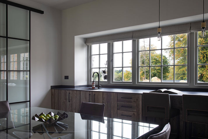A renovation of an existing Coach House and construction of new build glass link to Main House. We joined this project at its earliest conceptual stages collaborating closely with our client, the architect and the contractor throughout the construction process. The brief was to create a ‘Scandi’ inspired, contemporary multi-use space for the entire family. The design incorporates guest accommodation, a dedicated workspace, a kitchen, bar, games room and changing facilities for the adjacent outdoor pool. Neutral pared back tones bring a harmonious and relaxed feel to the clean, minimalist interiors. Internal Crittall doors create separate spaces while not obstructing views to the outside and wood flooring throughout enhances the sense of flow between areas.